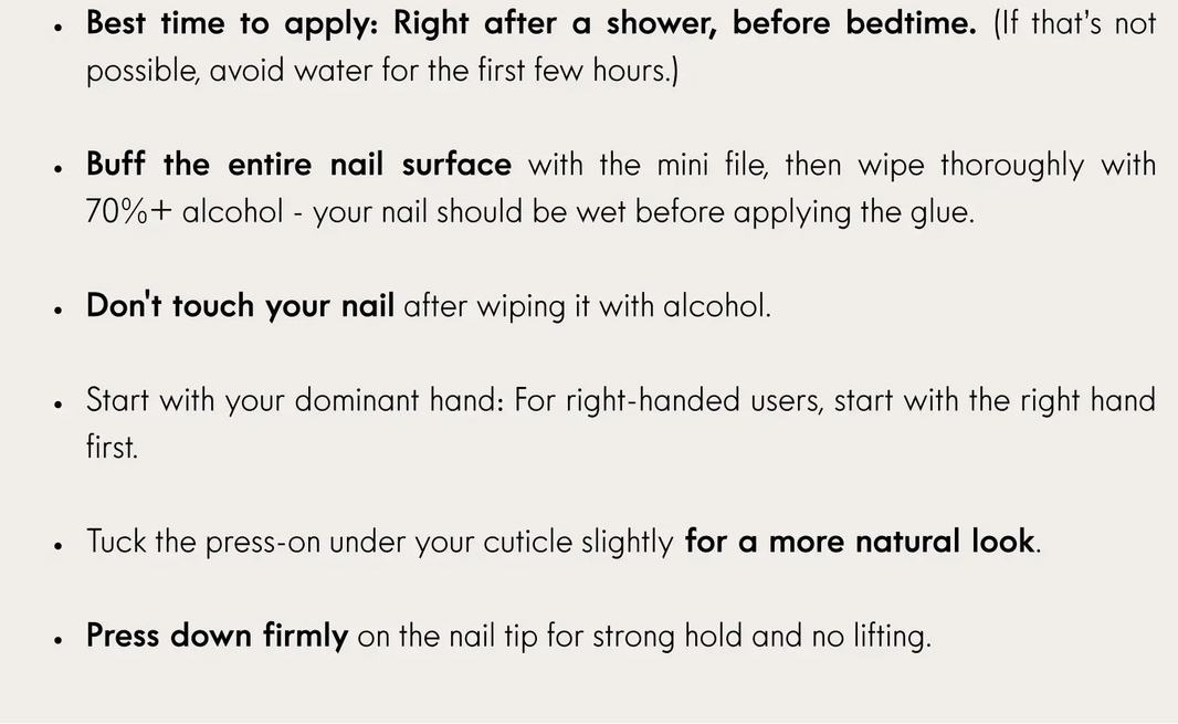 One of the main reasons press-ons lift prematurely is poor natural nail prep. Follow these tips to make sure your nails last beautifully: