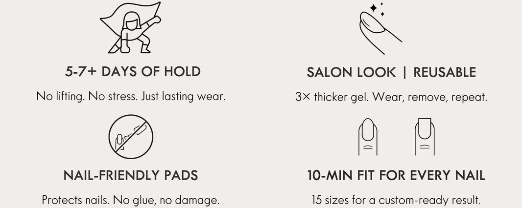 Our false nails are made from soft gel, a flexible material that’s 3x thicker than standard plastic tips. That means better comfort, a more secure fit, and a natural-looking finish.
